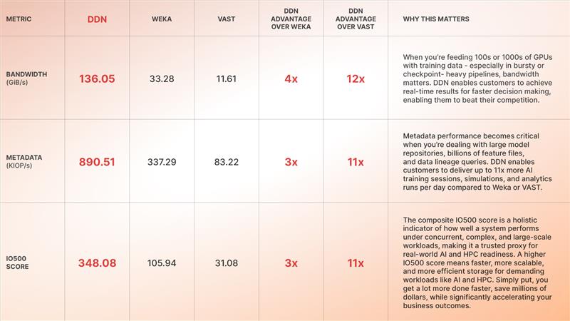 • DDN dominates the IO500 benchmark, outperforming VAST and Weka by up to 11x across real-world AI and HPC workloads.